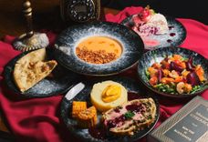 1260 г • Салат «Встреча на Патриарших» (тигровые креветки подаются с миксом салата, свёклой, морковью и томатом черри под медово-горчичным соусом), Крем-суп «Строки между строк» (сливочный крем-суп с форелью, картофелем и морковью дополняется хондаши и кимчи, подаётся с микрозеленью, луком фри и фокаччей), Основное блюдо «Пир у Воланда» (веллингтон из свинины подаётся с картофельным пюре, пюре из моркови и початками кукурузы, дополняется ежевичным соусом и микрозеленью), Десерт «Поцелуй Маргариты» (меренговый рулет с чёрной смородиной дополняется джемом из ежевики и свежими ягодами)